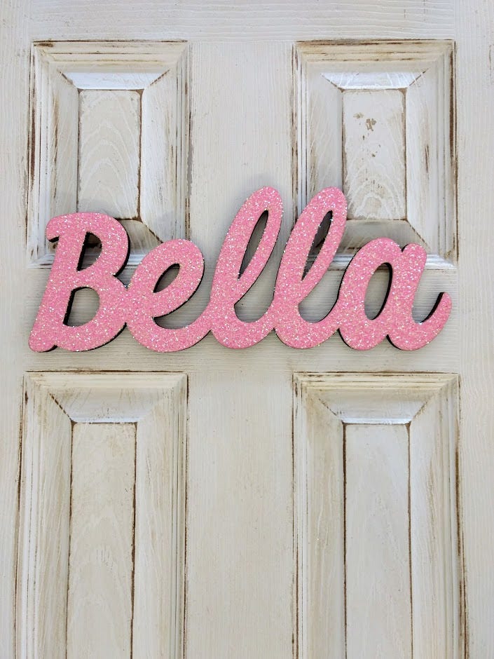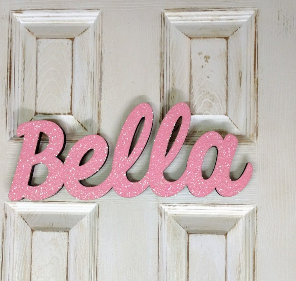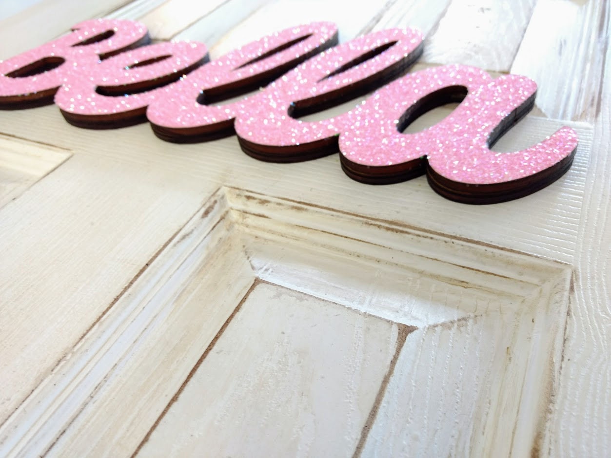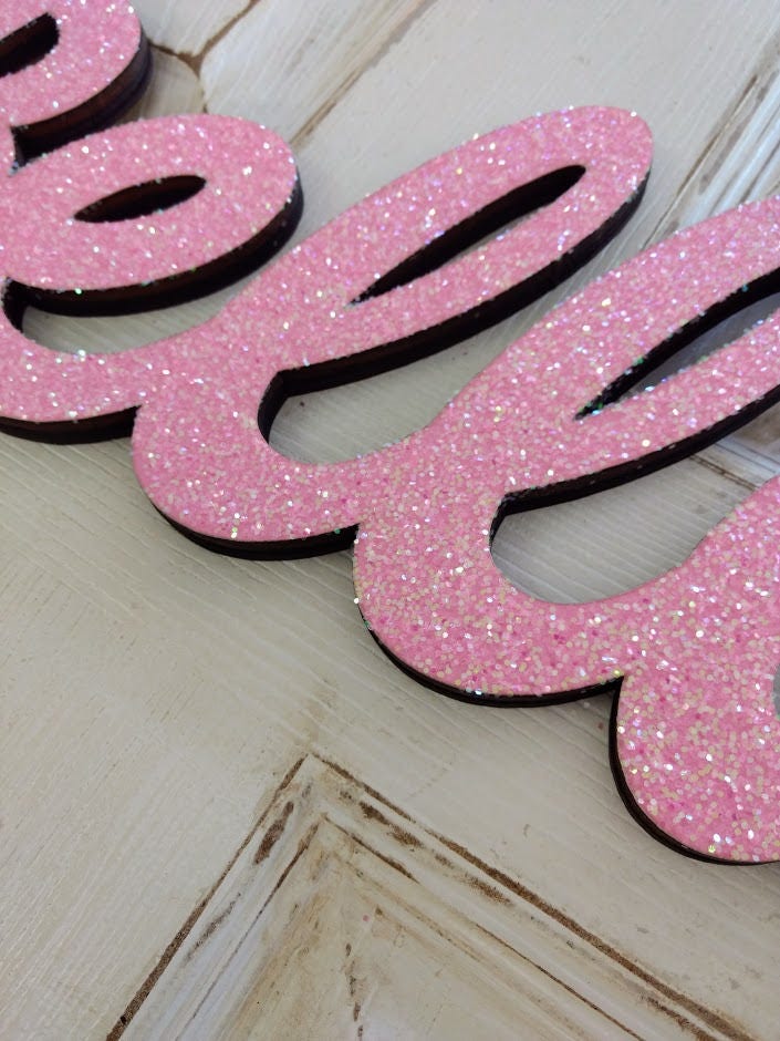 -Color shown in soft pink glitter. Sides of sign not painted to reveal rustic laser edge, but sides can be painted if preferred. Please see below link for paint add-on.