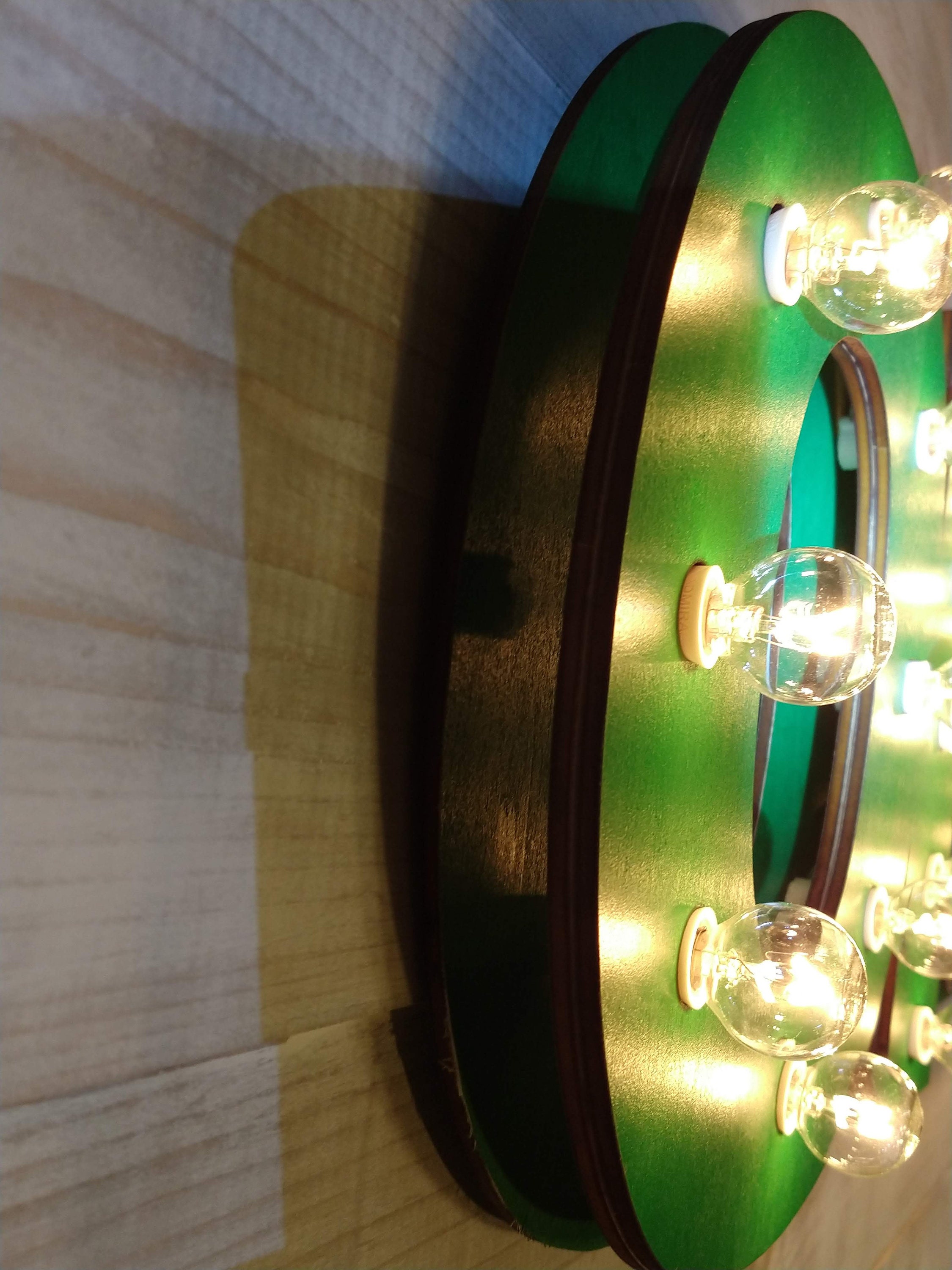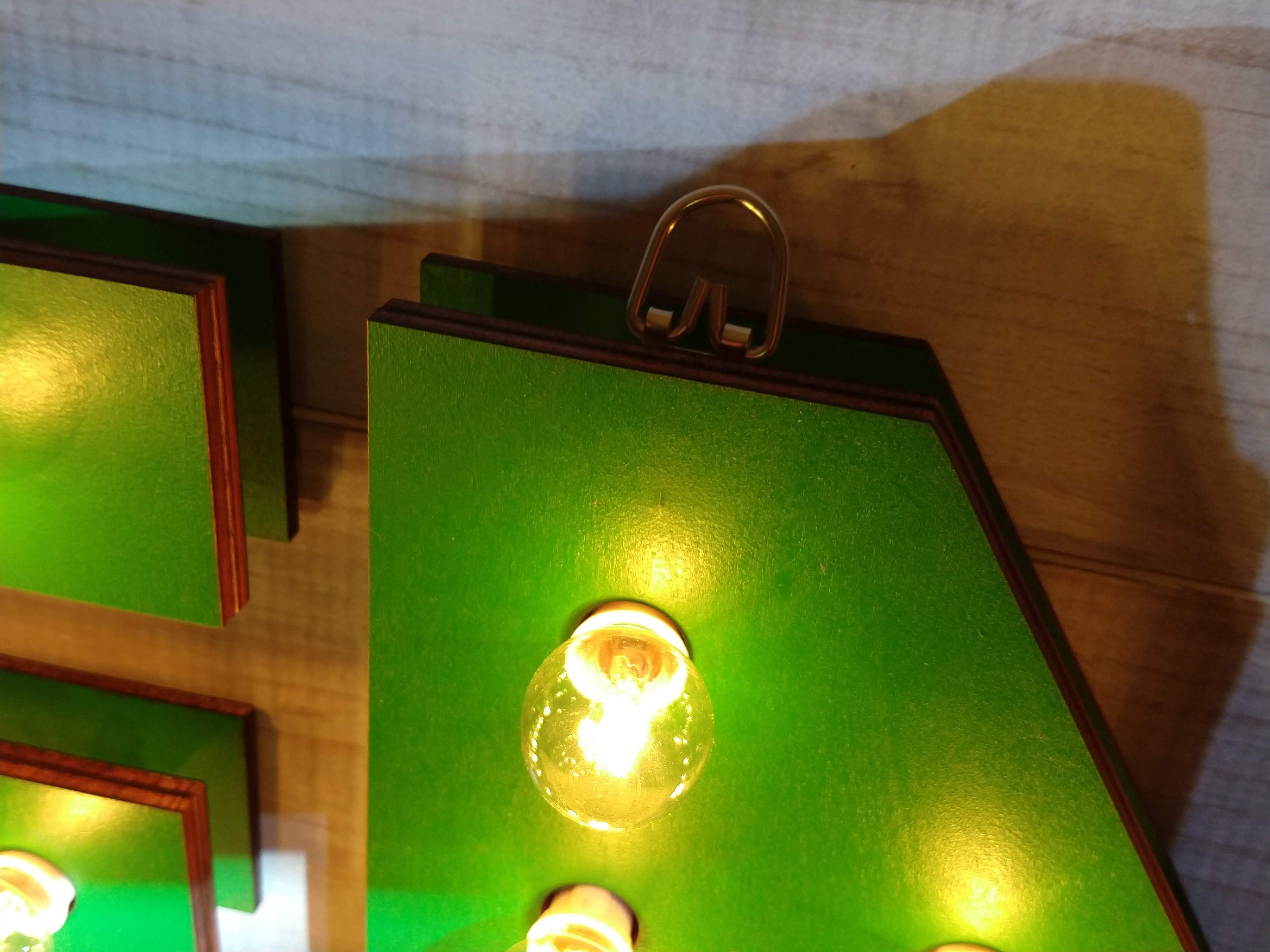 Each piece is laser cut from birch plywood, Hand painted with Marquee lights. The lights are 120 volt with On-off switch on cord. The sign has option of finished back or open back which will show cords and sockets. will have D Rings and saw clips for Hanging.